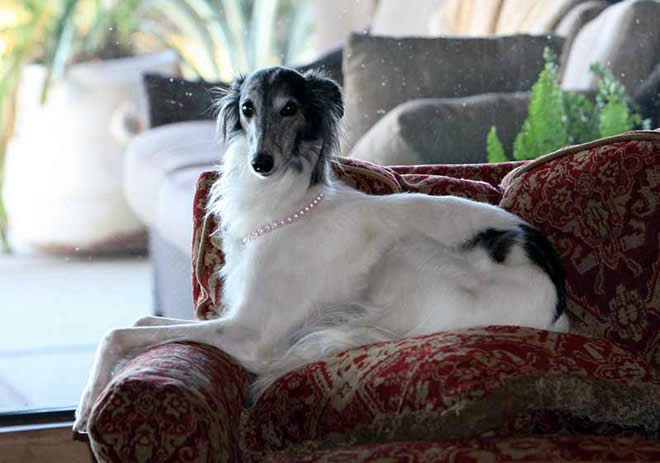 Abby lives at Stonewall Farms in Scottsdale, Arizona, with Scott Bailey and David Cains. She loves to run with their beautiful Arabian horses and then come inside to sleep on the bed or couch. Here she is wearing her good pearls. |