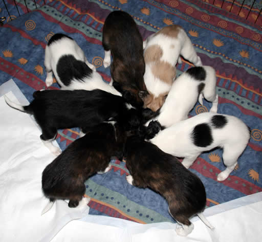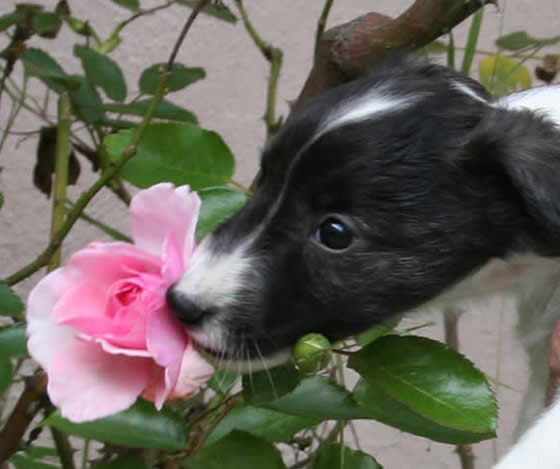 | At five weeks of age, the Garden Roses puppies have grown both physically and mentally. It is so amazing to watch them learn new things each day, from smelling (or eating) roses to playing with toys to the joy of running in tall grass. Several of these puppies are available to the right homes, so feel free to submit one of our puppy questionnaires. Here they are at five weeks old: |